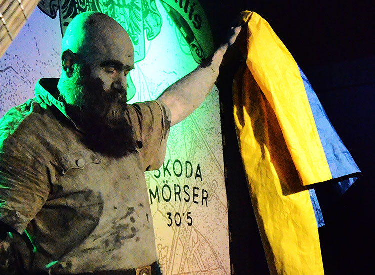 Als nach knapp 20-minütiger Umbaupause das Schlagzeug von „K.K. LIR. Lemberg Nr. 19 Fähnrich“ Rostyslaw Potopljak mit Bildern der Škoda 305 mm Haubitze flankiert wurde, die man vor dem Konzert mit viel Mühe auf die Seitenbühne des Clubs Nachtleben geschoben hatte, folgte dieser mit dem Rest der Truppe in weiteren Uniformen aus dem 1. Weltkrieg.
