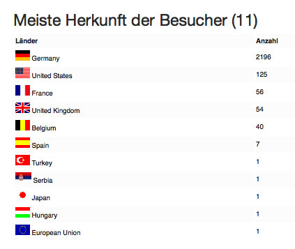 Außerdem sind einige internationale Gäste zu verzeichnen. Die meisten Abrufe kamen aus den USA, gefolgt von Frankreich und Großbritannien. Aber auch aus Belgien, Spanien, Ungarn, der Türkei, Serbien und sogar Japan haben sich schon vereinzelt Sympathisanten des abgedrehten Sounds zugeschaltet. Woher sie von diesem Angebot erfahren haben, wissen wir nicht, da die Site (noch) nicht suchmaschinenoptimiert ist. Wir vermuten Mundpropaganda, das gelegentliche Posten von Links zu diesem Blog über Facebook (wobei das nicht von uns kam) sowie unsere Kurzmitteilungen über Twitter (dazu später mehr).