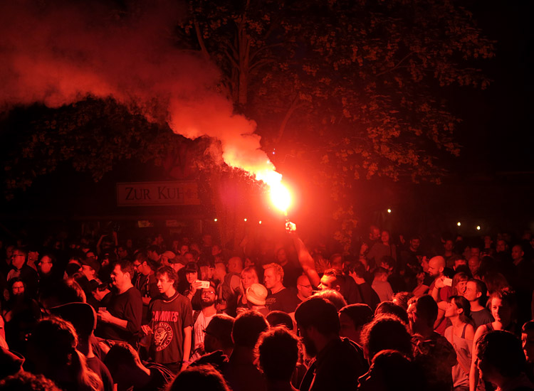 Wirklich begeistern konnte die Band allerdings nicht. Vor der Bühne gab es während des Gigs kaum Bewegung und die recht sperrigen Songs animierten nicht dazu, das Geschehen längere Zeit zu verfolgen. Manche sprachen gar vom langweiligsten Sommerfest-Headliner aller Zeiten. Die Darbietung kam doch arg altbacken und eingerostet rüber, irgendwie wurde man den Eindruck nicht los, dass die Stücke entweder schlecht gealtert sind oder schlichtweg nicht sonderlich gut ihm Ohr bleiben. Insofern hinterließ der Gig der NEWTOWN NEUROTICS nicht nur bei mir gemischte Gefühle. Einerseits war‘s nett eine punkhistorisch bedeutende Band zu sehen, andererseits war es in allen Belangen kein guter Auftritt.