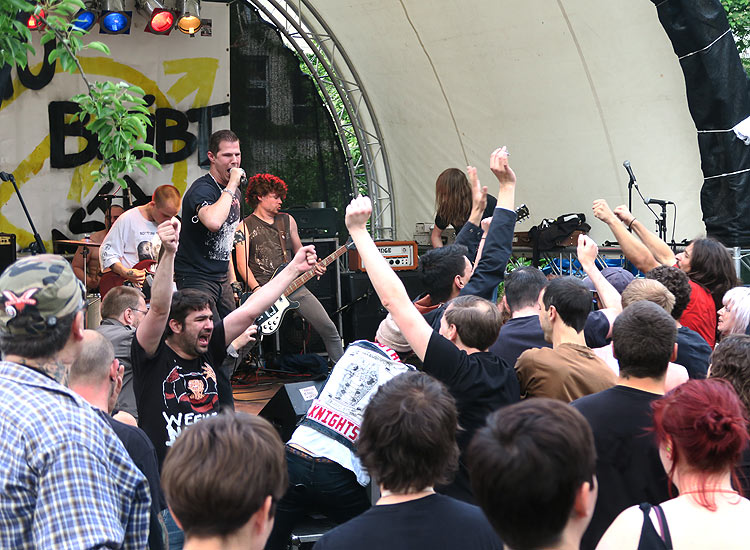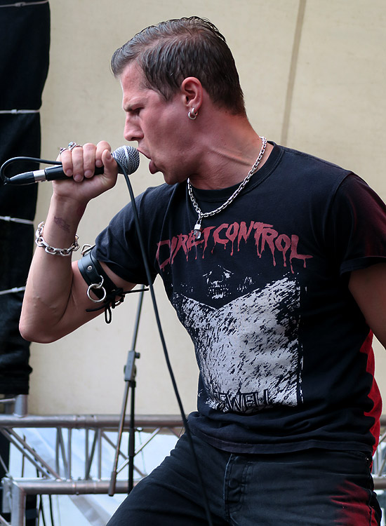 Umso erfreulicher war es, dass sie beim Au-Fest auftraten und noch dazu nicht als Opener, sondern mittendrin. Das Quintett präsentierte ein Hardcore- Brett alter Schule, das mit hohen, aggressiven Vocals aufwartete, die man eigentlich eher von Thrash- und Speed-Metal-Acts kennt. Doch Shouter Solomon (rechts) kann nicht nur hoch, bei einigen Songs ließ der junge Mann auch Sangesqualitäten eines Glenn Danzig oder Lee Ving erkennen und sorgte somit trotz der harten, schnellen Tracks für viel Abwechslung. NIGHT FEVER waren ohne Zweifel die Überraschung des Festivals und meiner Meinung nach der beste Act des Tages.