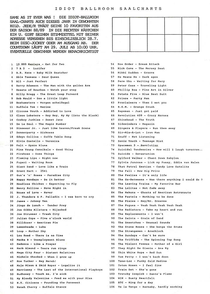 Einmal im Jahr war es Zeit für die „Idiot Ballroom Saalcharts“. In den Wochen zuvor konnten im Rahmen eines Gewinnspiels Stimmzettel abgegeben werden, welche Songs die „Hits der Saison“ gewesen waren. Am Saalcharts-Abend wurden die meist gewählten Tracks im Countdown heruntergespielt, die jeweilige Position mit Interpreten und Titel als Diashow an die Wand geworfen (ja, damals gab es noch keine Beamer…). Das war kurzweilig und beeinflusste nicht selten das Kaufverhalten beim Plattendealer unserer Wahl.