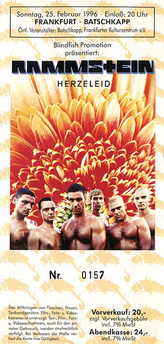 Als die Kapp-Tickets noch schön aussahen: SCREAMING BLUE MESSIAHS, 1988 (oben) und RAMMSTEIN, 1996 (rechts)