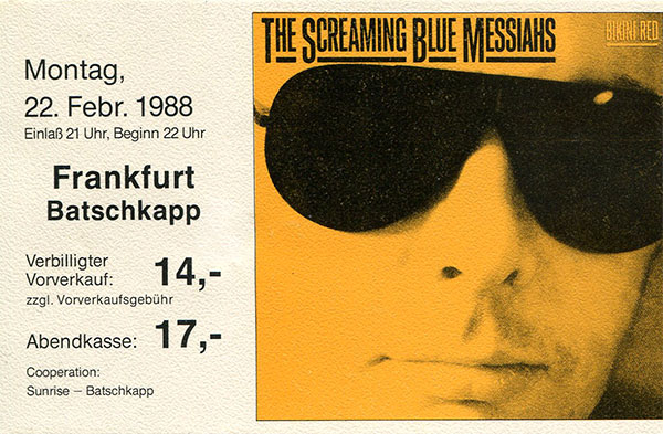 Gigs von Stan Ridgway (Ex-WALL OF VOODOO), den BOLLOCK BROTHERS und den SCREAMING BLUE MESSIAHS schlossen sich an. Meine Highlights aus mehr als 25 Jahren Batschkapp-Konzerten aufzuzählen, ist ein Ding der Unmöglichkeit. Es gab (zu)viele denkwürdige.
