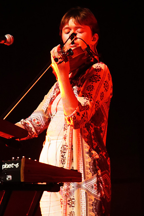 White veröffentlichte bisher zwei LPs (2020 & 2023) sowie diverse EPs mit Songs, die man nicht auf den Alben findet und die zum Teil zu seinen absoluten Sternstunden gehören. Mit einem davon, „Colder Heavens“ von der gleichnamigen EP von 2017, fing der sowohl mit Lottie Gabriel an Violine nebst Keyboard als auch Alec Hewes an weiteren Saiteninstrumenten und Trommel verstärkte White pünktlich um 20 Uhr an und machte damit schon mal eine Ansage – gehört das Stück doch zu seinen beliebtesten, wie man an den euphorischen Reaktionen im Publikum bestätigt bekam.