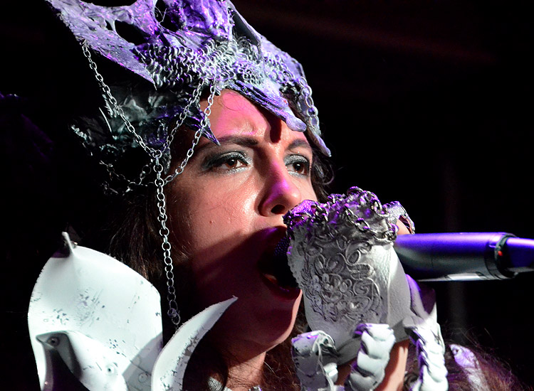kam rechtzeitig, um den Auftritt der Duisburger SARIOLA zu sehen. Und der war ziemlich ungewöhnlich. Auf der Bühne waren zwei Gitarristen, ein Drummer und eine Sängerin zu sehen, die allesamt in Kostüme gehüllt waren, die an Holiday on Ice, einen tschechischen Märchenfilm aus den Siebzigern oder die neueste Mode- Kollektion von Harald Glööckler erinnerten.