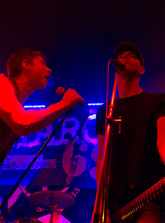 und dafür mit Hand und Fuß. Für mich ganz vorn: „Casse toi!“ (Verpiss Dich!) von der 2000er-LP „Région Sacrifièe“ sowie „Univers sale“ von der gleichnamigen Scheibe von 2003, das den Zuhörern diesmal gleich als Opener um die Ohren geblasen wurde und natürlich „Communication zero“ („Conflit interne, 2007). Vom aktuellen Album „Resistance Electrique“ von 2011 fanden unter anderem „Generation Sans Repere“, „Legitime vengeance“ und „Silencio“ Aufnahme ins Set. Allesamt Klopper, schnell, unwiderstehlich und keinen Takt zu lang.