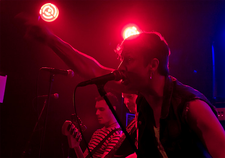 Anfangs vermochte der Funke noch nicht so richtig auf das Publikum in der Au überzuspringen, obwohl das Quintett mit „A la chaleur des missiles“ eigentlich den perfekten Einstieg wählte. Wieder mal bildete sich der Frankfurter Kreis, zwei Meter „Bannmeile“ vor der Bühne, in die nur allmählich eingedrungen wurde. Dabei verströmten die Buben Spielfreude pur, die man insbesondere dem agilen Sänger, dem irgendwann ein Hüpf-Gen implantiert worden sein muss, zu jeder Zeit anmerkte.