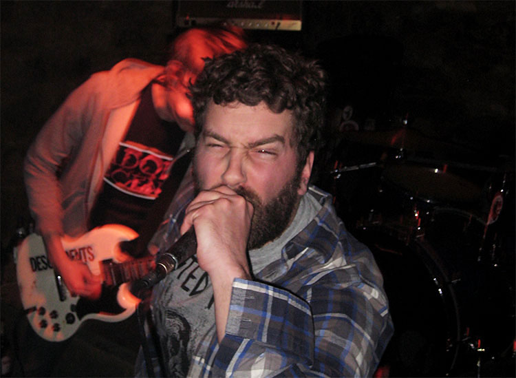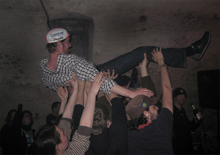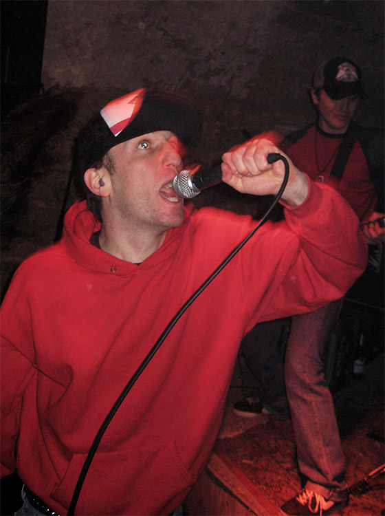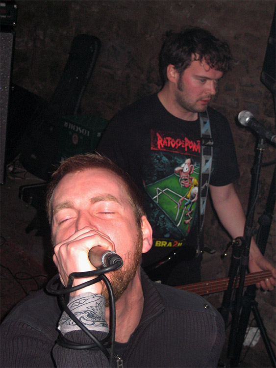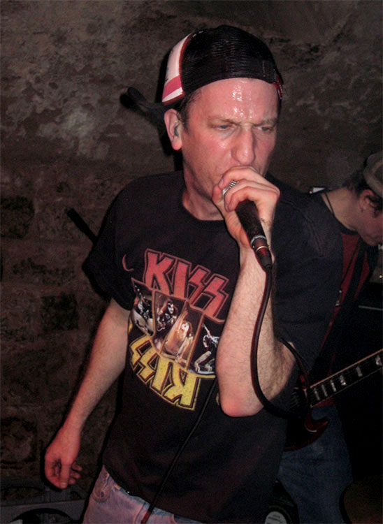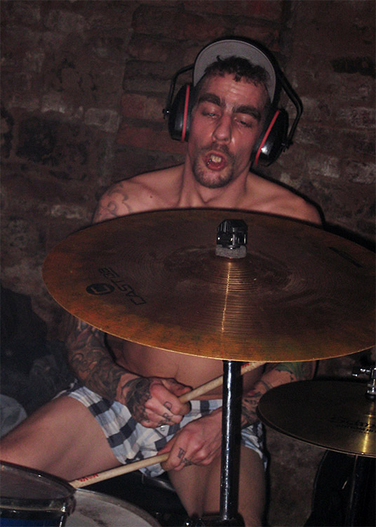 Inzwischen war auch Drummer Dudel eingetroffen, so dass SCHEISSE MINNELLI nun komplett die Bühne entern konnten. Shouter Sam und Gitarrist Mikey waren bereits sichtlich angeschlagen, da bereits seit dem frühem Mittag mit den Holländern gefeiert wurde. Auf dem Podest rissen sich die beiden Amerikaner aber nochmal zusammen und boten zu später Stunde die Highlights ihres bisherigen Schaffens dar. Angepeitscht von der frenetischen Meute – nun trat auch wieder die SUICIDAL-Fraktion vor der Bühne in Aktion – zelebrierten die Frankfurter einen Atomschlag im Müllcontainer und verlangten dem Publikum noch einmal alles ab.