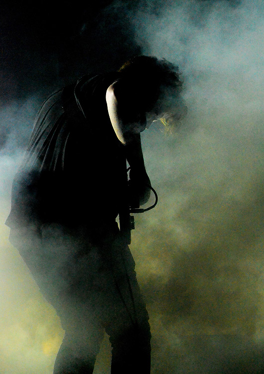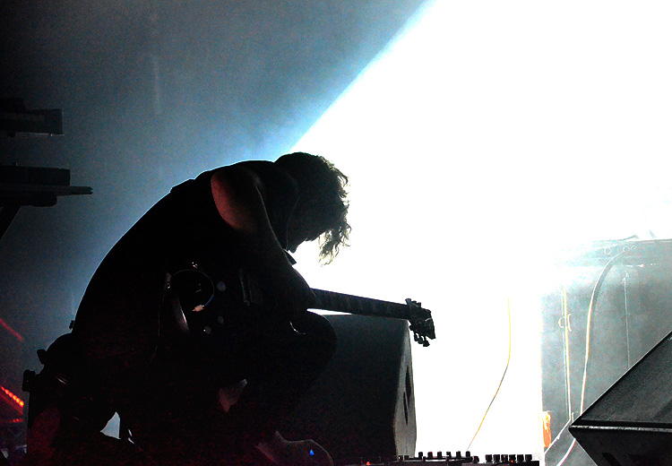 in Richtung DARKSIDE gezielt, die etwa um halb zehn auf die stockdunkle Bühne kamen. Viel änderte sich an der Beleuchtung auch nicht; ein wenig einfarbiger wurde es im Laufe der Show, aber stetig düster. Die sich zugewandten Musiker, die den ganzen Abend nur einmal das Publikum kontaktierten (auch da lässt Davis grüßen), waren nur auf sich konzentriert, das Publikum schien geduldet.