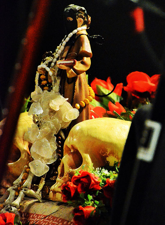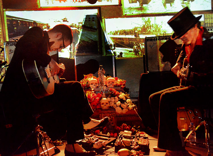 rechts, nach links und in die Hocke, soweit das meine Gelenke noch mitmachen. Die (leere) Bierpulle lässig in die Westentasche gesteckt. Ich kam mir vor wie David Hemmings in „Blow Up“, nur dass ich mich nicht um Jane Birkin rekelte, sondern um die DEAD COMBO, die um 20.50 Uhr ihre Show begann. Auf der Bühne stand ein hübscher Altar mit maskierter Barbiepuppe, Totenschädeln und vielen Rosen in der Mitte – daneben die Hocker, auf denen, einander zugewandt, Tó Trips und Pedro V. Gonçalves musizierten. Ersterer den ganzen Abend lang mit Gitarren, letzterer auch mal mit einem Kontrabass oder kleinen Plastiktuten. Oder beidem.