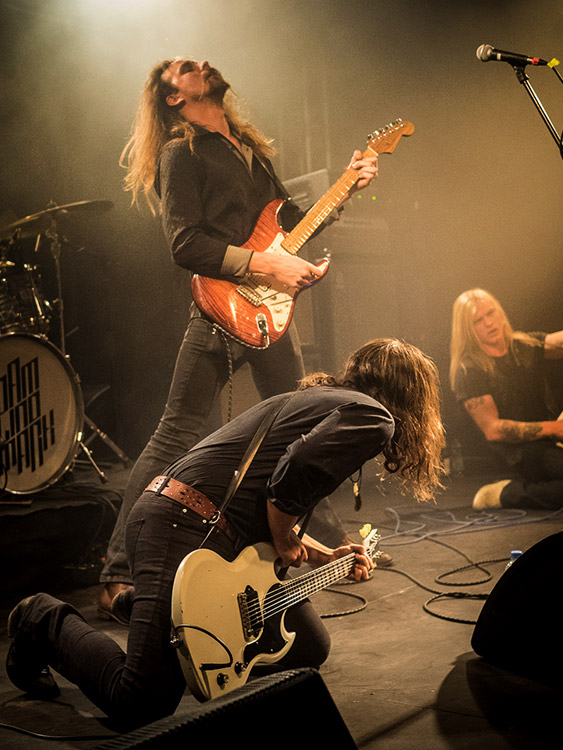 Dass dieser aber letztlich ziemlich klasse werden würde, war mir vorher nicht klar – live hatte ich DEAD LORD wohl als Einziger im Saal bisher nicht gesehen, beim Reinhören in die Scheiben zudem nie den Eindruck einer gewissen Einzigartigkeit gehabt. Solide Songs, denen von den meisten Schreibern eine mal mehr, mal weniger existente stilistische Nähe zu THIN LIZZY attestiert wird (ein Vergleich, der dem Sänger und Gitarristen