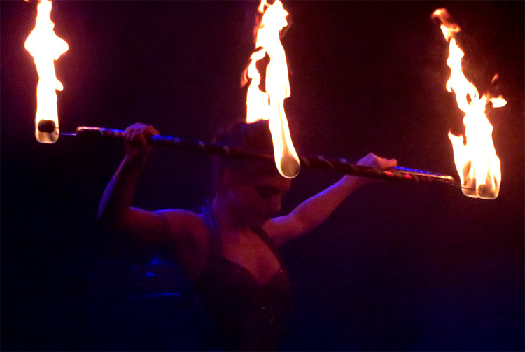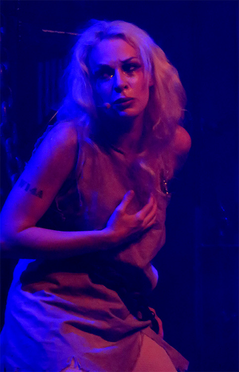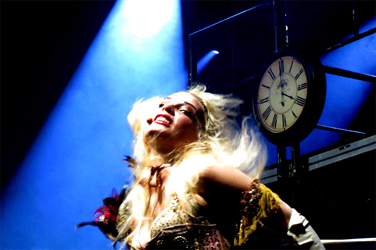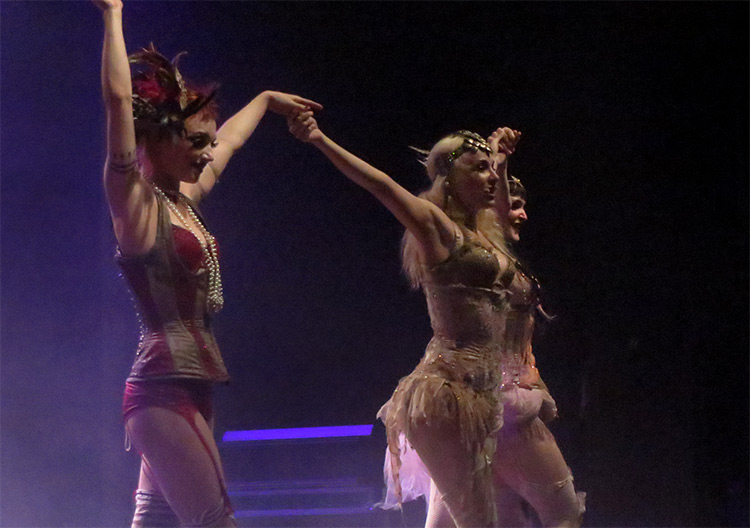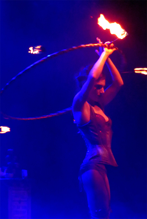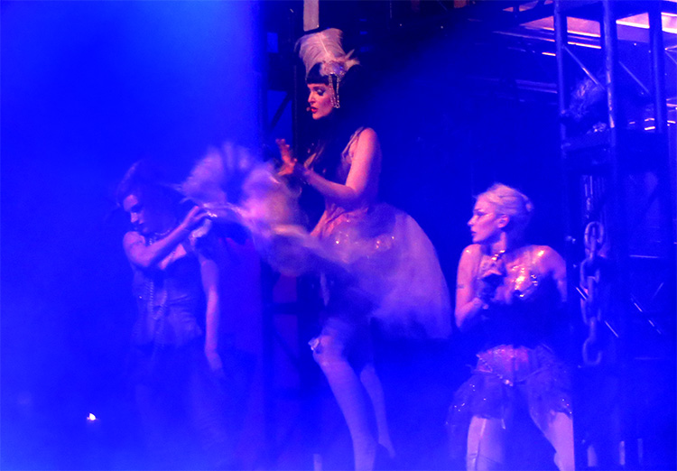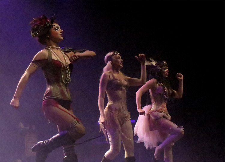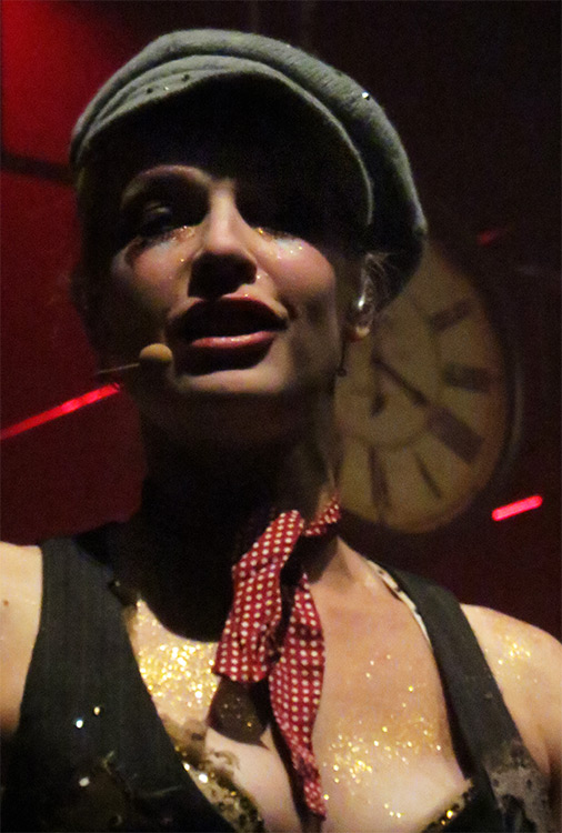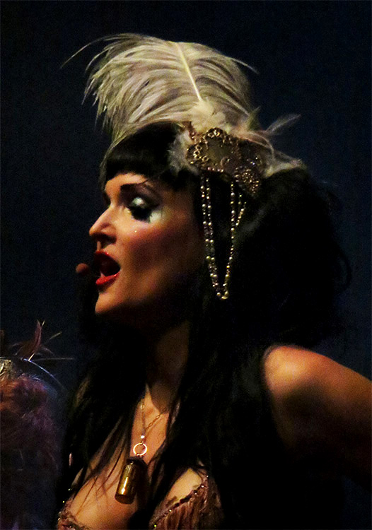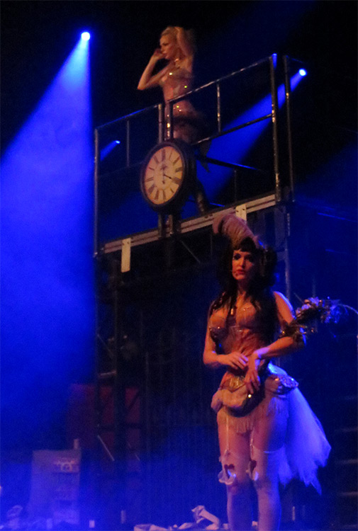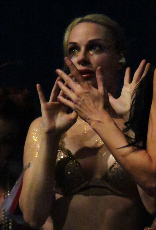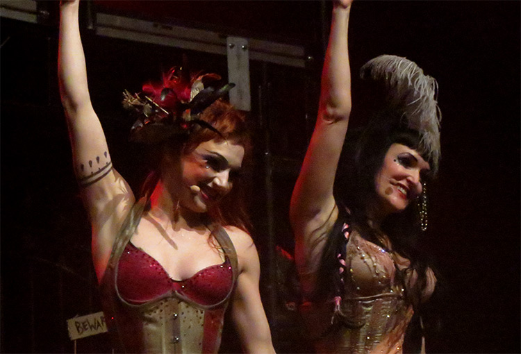Die kam dann aber in geringen Dosen doch. Eine der beiden Mitstreiterinnen, die mich leicht an Jane Russell erinnernde Veronica Varlow, brachte ein Burlesque-Zwischenspiel mit anschließender Einladung, eine Dame im Publikum bezüglich gleichgeschlechtlicher Küsse zu deflorieren.