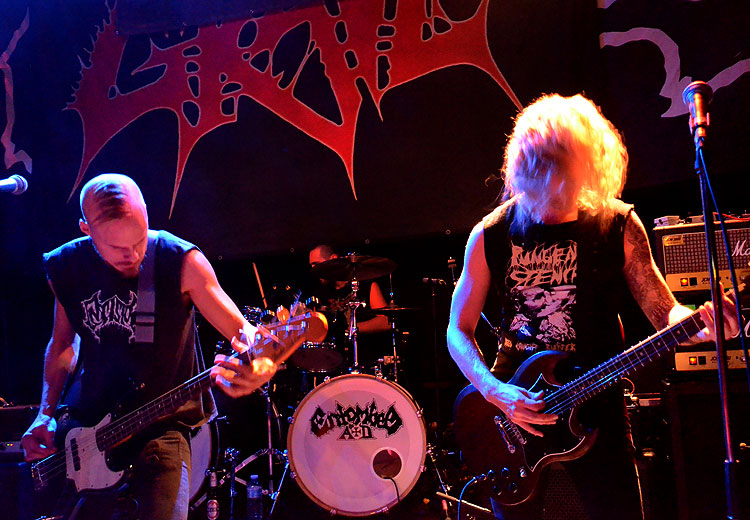 Was Death Metal betrifft, bin ich ein ziemlicher Kretin. Während Fachleute sofort den Unterschied heraushören zwischen schwedischem DM und dem aus Florida, so kann ich das auch; aber nur,wenn ich mich auf maximal zwei Bands aus den jeweiligen Gegenden beschränke. Kommen noch zehn dazu, aus unterschiedlichen Epochen gar, bin ich nur noch verwirrt. Das sind jetzt also Schweden, die nicht nach Schweden klingen, weil sie den US-Sound vorziehen, aha, soso. Und das hier schwedisch klingende Schweden, gefolgt von schwedisch klingenden, äh, Wiesbadenern? Nachdem ich heute zum Frühstück vier Stunden Death Metal gehört habe von sechs unterschiedlichen Combos raucht mir die Birne und ich sehne mich nach ein wenig JEX THOTH, aber die sind erst Ende des Monats dran. Am vergangenen Montag aber, dem Abend des Konzerts, spielte sich das für mich ganz anders ab. Nämlich so: