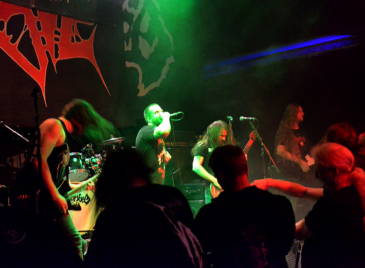 Lebenden zurück, vielen Dank dafür. Kollege Marcus hat denen als Support für TOXIC HOLOCAUST (Bericht hier) ja schon die Nähe zu schwedischen Bands á la DISMEMBER attestiert, meinetwegen, kann ich nichts zu sagen. Tatsache war, dass die Wiesbadener einen gar nicht so kleinen Fanclub vor der Bühne hatten, der schon ordentlich Bohei machte, als viele Gäste noch gar nicht eingetroffen waren. WOUND, deren Demo mal das des Monats im Rock Hard war, klangen mehr als ordentlich, machten mich aber auch nicht sofort zu deren Jünger.