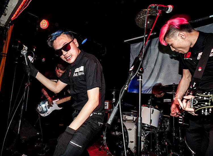 Internationale Punk-Wochen in der Au: Nachdem am vergangenen Samstag der mexikanische Street-Punk-Act ACIDEZ den Rödelheimer Club beehrte, folgte nun mit GUM BLEED eine Formation aus dem Reich der Mitte. Punk aus China – darüber hatten wir in diesem Blog bereits berichtet, als die Band DEMERIT im Jahr 2013 im Club „Das Bett“ gastierte und bei uns einen durchwachsenen Eindruck hinterließ (klicke hier). Mit GUM BLEED machte nun ebenfalls eine Gruppe aus Peking Station in Frankfurt. Während die Kollegen von DEMERIT schon aufgrund ihrer Optik deutlich im Street-Punk-Genre zu verorten sind, ist die Einordnung bei GUM BLEED weitaus diffiziler. Als die 2006 gegründete Formation zu