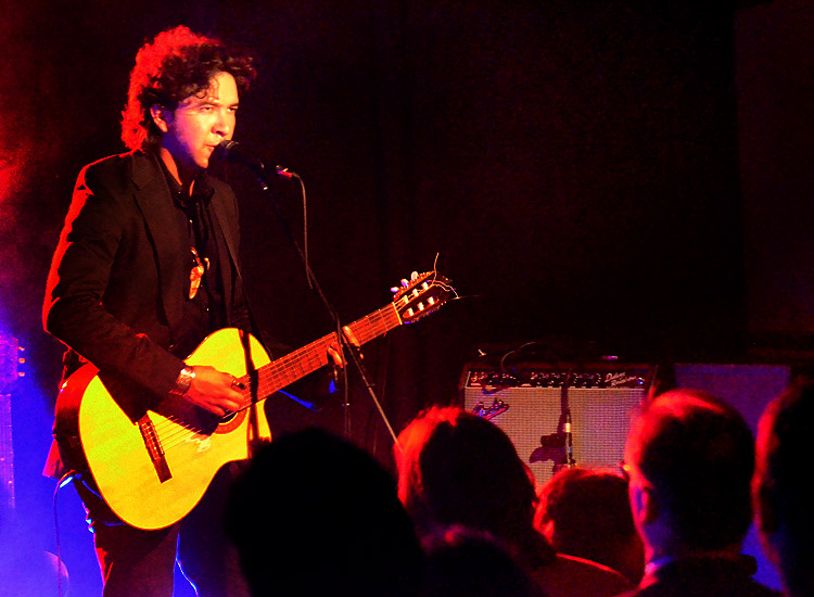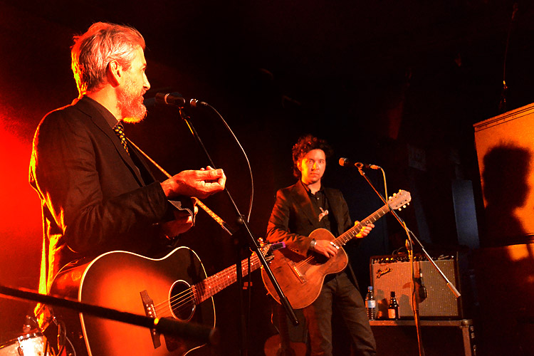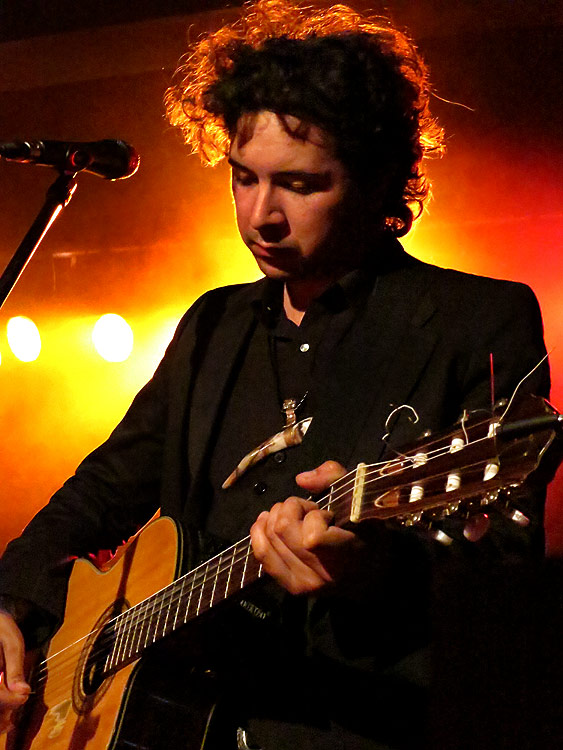 Als Begleitung und außerdem Vorprogramm hatte Gelb den ebenso wie er aus Tucson, Arizona stammenden Gabriel Sullivan (links) dabei, der, wegen anschließender Disco im Club, früher als von einigen erwartet die Bühne gegen 20 Uhr enterte. Leise und meist mit geschlossenen Augen intonierte er ein paar Songs, sprach bzw. nuschelte