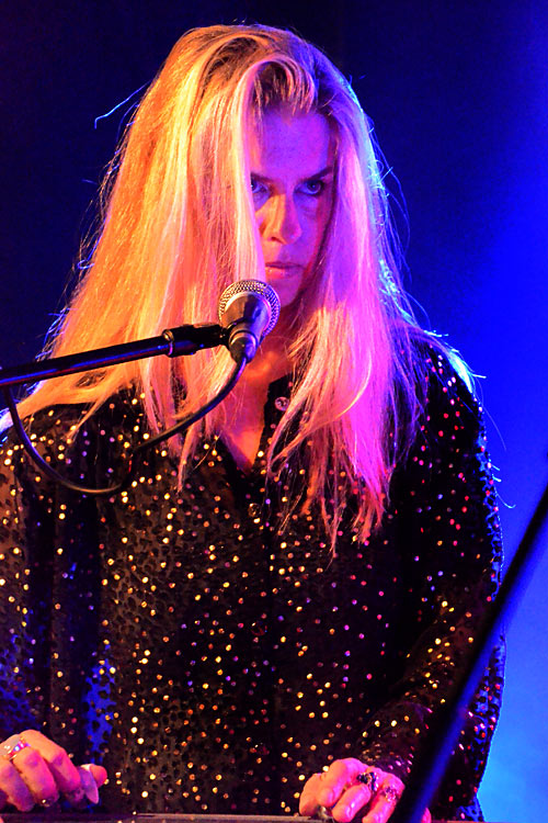 Die erste war die Steel-Guitar-Virtuosin Maggie Bjørklund (links). Die Dänin spielt in den Staaten mit Leuten wie John Doe (X), CALEXICO oder Mark Lanegan und ist vor allem Mitglied von Jack Whites Frauenbegleitband THE PEACOCKS. Zum jetzigen Zeitpunkt standen hier schon Hochkaräter auf der Bühne, mit deren Mitwirken man ruhig im Vorfeld hätte werben können, wie ich finde. Dann stieß ein gewisser Christof dazu, dessen Zunamen ich leider nicht verstanden habe (Ihr vielleicht? Checkt den gleich folgenden Clip): Noch eine dezente, erlesen nuancierte Gitarre dazu, wunderbar. Und dass erstmals an diesem Abend ein leichter Rhythmus am Schlagzeug zu erleben war ging auf das Konto des sich reinschleichenden Meisters himself: Howe Gelb schlug ein paar