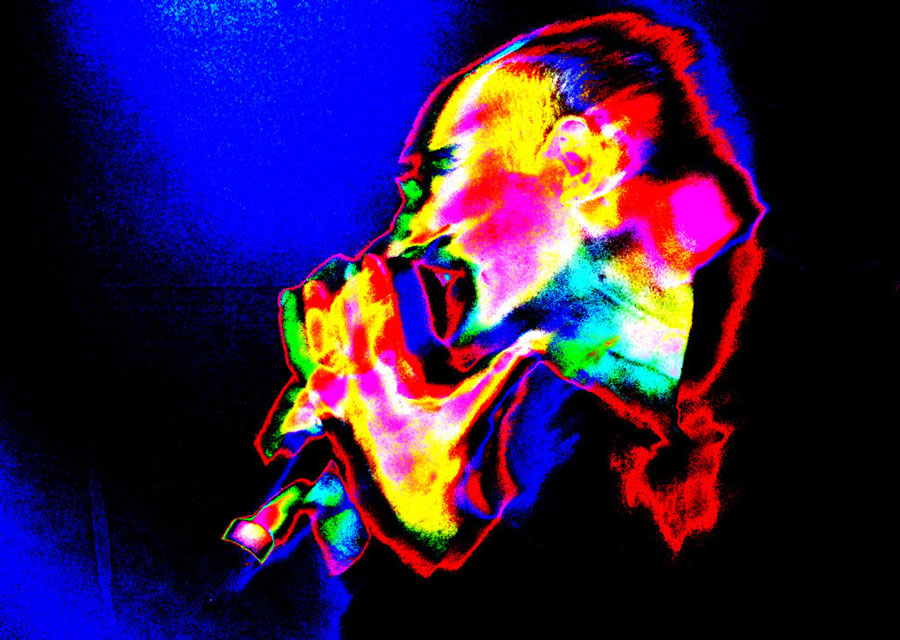 Bild 2 (0ben): Sänger Gabi Delgado-Lopez am Mikrofon beim Konzert von DAF im KUZ (MZ) am 17.03.2010 – Originalfoto im Bericht nicht verwendet