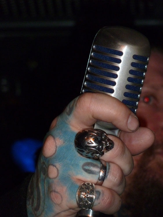 Bild 1 (oben): Die rechte Hand von Sänger Ski King am Mikrofon beim Konzert von SKI’S COUNTRY TRASH im Nachtleben (F) am 12.04.2012 – im Bericht wurde das Foto nicht verwendet
