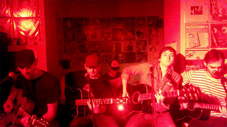 Doch am 5. Dezember ließ sich das alles ganz anders an: Das Quintett spielte anlässlich des 9-jährigen Jubiläums des Frankfurter Kneipenclubs Feinstaub unplugged auf. Da saßen sie nun, vier Jungs auf Hockern wie Hühner auf der Stange, die Klampfen in der Hand, dahinter der Mann an der Schießbude. Und bewiesen, dass sie es verstehen, die fantastischen LES SHERIFF-Songs auch auf diese Art zu interpretieren, um mir damit einen wohligen Schauer nach dem