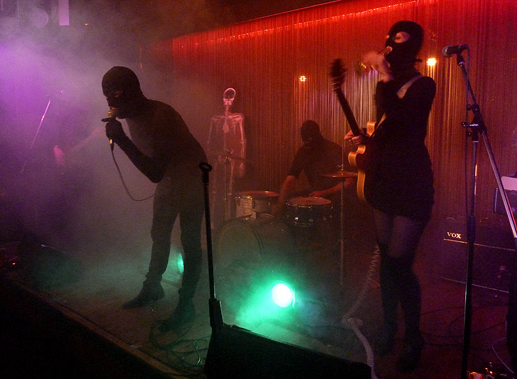 Und weil es so schön war, bleiben wir gleich im „Peel“ für Position 2. Gerade erst vor zwei Tagen stattgefunden und deshalb so eben noch in diese Aufzählung gerückt sind THEEE PSYCHO-JONES INVASION, die in der Late Show um 1.00 Uhr nach den FUZZTONES randurften. Was die vier Maskenmänner und die Maskenfrau bei ihren (leider recht seltenen) Gigs für ein Feuerwerk