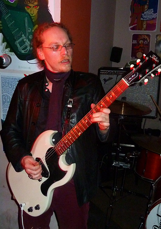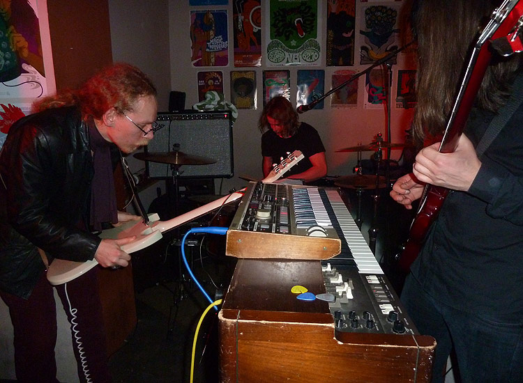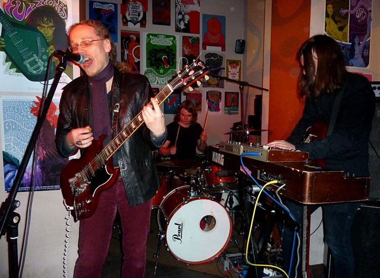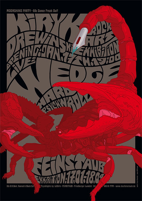 Die Musikkneipe Feinstaub im Frankfurter Nordend überrascht uns immer mal wieder mit feinen Aktionen, die weit über den Horizont einzelner Konzert- und mottolastiger DJ-Abende hinausgehen. Seit dem 17. Januar zeigt die In-Location nun im Rahmen der „Kiryk Rock Art Exhibition“ eine größere Anzahl von Postern, Flyer- und Plattenmotiven des Berliners Kiryk Drewinski. Zur Eröffnung der Ausstellung war der Künstler nicht nur selbst anwesend, er spielte mit seiner Psychedelic-Rock-Band WEDGE auch gleich noch eine Show. Gute Gründe für uns, dem Sänger, Gitarristen und Grafiker in Personalunion ein paar Fragen zu seinen musikalischen und künstlerischen Aktivitäten zu stellen.