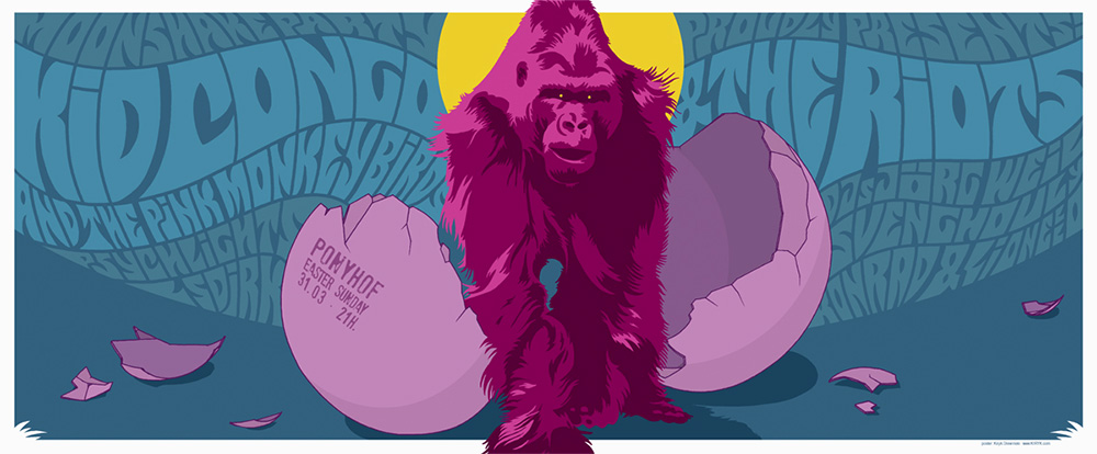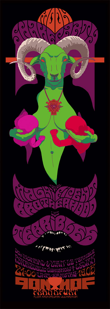 Sehr oft wähle ich lebende Motive wie Menschen oder Tiere, da ich mit „toten“ Gegenständen nicht viel anfangen kann. Wie schon erwähnt finde ich sehr große Inspiration in den Rockpostern der 1960er Jahre. Vor allem die Poster-Künstler der Westküste der USA jener Zeit wie Stanley Mouse, Wes Wilson und Victor Moscoso haben mich beeinflusst. Aber auch englische Künstler wie Hapshash and the Coloured Coat und Popart im Allgemeinen. Ebenso wie diese Leute bin ich auch großer Liebhaber der Kunst um 1900. Aubrey Beardsley, Alfons Mucha, Koloman Moser, Eugene Grasset und viele andere wären da zu nennen.