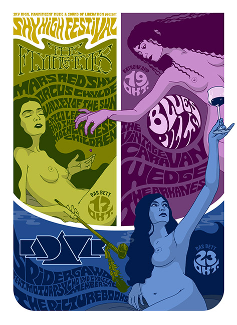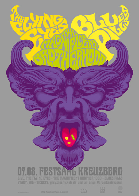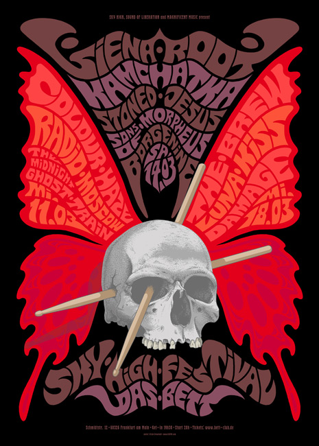 mir dann noch klar wurde, dass Graffiti seine Inspiration zum großen Teil aus Popart und der bunten Posterwelt der Rockszene der 60er Jahre zog, „landete ich in den 60ern“ und entdeckte meine Gitarre wieder, die ich im Kindesalter von meinen Eltern bekommen, aber seitdem nicht angerührt hatte. Eines Tages brauchte meine erste Psychedelic-Band ein Gig-Poster und so mache ich nun seit über 20 Jahren psychedelische Poster und Rockmusik.