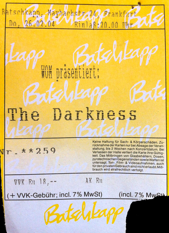 „guten alten“ Batschkapp. THE DARKNESS wurde auf der Insel nach dem Kracher „I Believe in a Thing Called Love“ förmlich gen Himmel gehypt und somit war das Konzert in Frankfurt blitzschnell ausverkauft. An dem Abend hatte ich allerdings noch eine Karte übrig und als ich auf dem Schwarzmarkt nach einem Ticket gefragt wurde und ich leise „50“ sagte, hatte ich wenige Sekunden später einen 50-Euro-Schein in der Hand. Die Band, die insbesondere wegen der Falsettstimme des Sängers Justin Hawkins immer etwas belächelt wird, lieferte eine wahnsinnige Show ab. Die Songauswahl beschränkte sich aber auf den aktuellen Longplayer „Permission to Land“ und nach etwas mehr als einer Stunde war Feierabend. Länger spielte die Formation im Februar 2020 in der „neuen“ Batschkapp. Und das war auch mein bisher letztes Livekonzert… (evr)