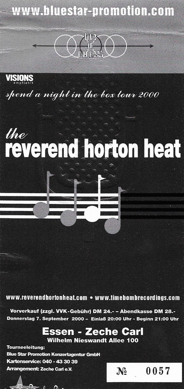 REVEREND HORTON HEAT live ist. Denn ich hatte die Texaner noch nie gesehen, wohl aber von ihrem Ruf als Brett auf der Bühne gehört. Ich wurde nicht enttäuscht und weiß noch ganz genau (ich war übrigens mit dem Auto gefahren und somit nüchtern), wie mir die Kinnlade runterklappte, weil da Leute musizierten, deren Fähigkeiten die der meisten anderen in diesem Genre weit überstiegen. Der Laden war proppenvoll (einschließlich der Empore) und irgendwie herrschte eine Stimmung wie in der Oper. Die Reise hatte sich gelohnt. Zumal dies bislang mein einziges RHH-Konzert geblieben ist. Ich hatte zwar eine Karte für ein Konzert mit REVEREND HORTON HEAT und den DELTA BOMBERS im Mai 2020 in Manchester, doch das fiel wie so viele andere leider der Pandemie zum Opfer und wird auch nicht nachgeholt. Vorband damals in der Zeche Carl waren übrigens die deutschen Garagenhelden THE RAYMEN, die ich zum ersten Mal als Vorband der METEORS an meinem 16. Geburtstag gesehen hatte (das war nicht 2000). Ein Bonus. (jr)