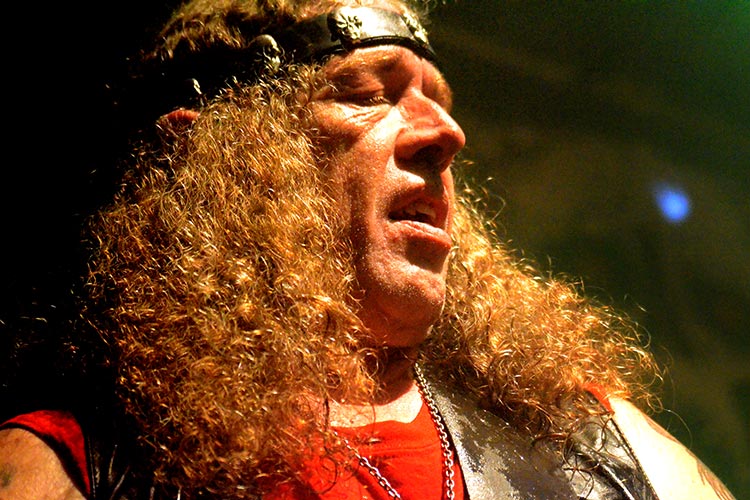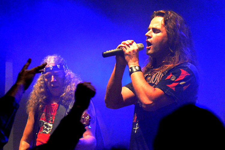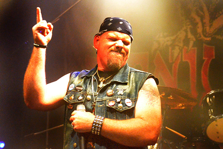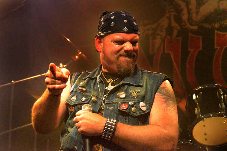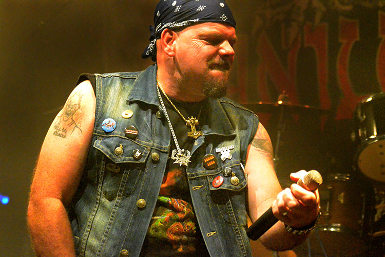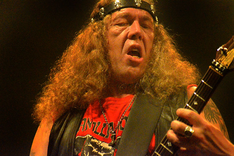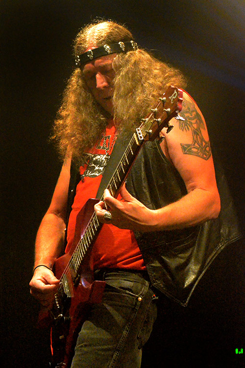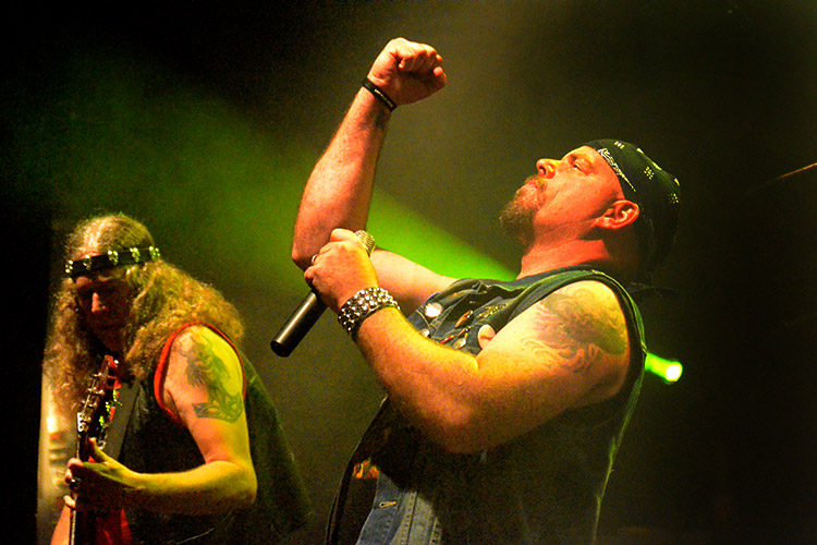 Zumindest live hält er sich inzwischen als Sänger zurück, um sich aufs Gitarrenspiel zu konzentrieren. Mit dem Ex- Roadie Bryan Patrick (rechts) wurde ein neuer Shouter gefunden, der Sheltons Gekrächze erstaunlicherweise nahezu perfekt imitiert. Als Drummer fungiert seit 2011 der Deutsche Andreas Neuderth, der auch bei ROXXCALIBUR und dem Opener MASTERS OF DISGUISE tätig ist.
