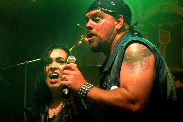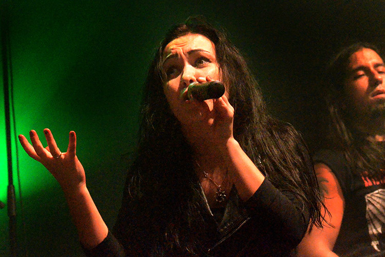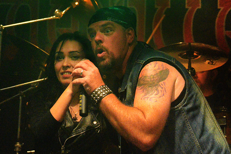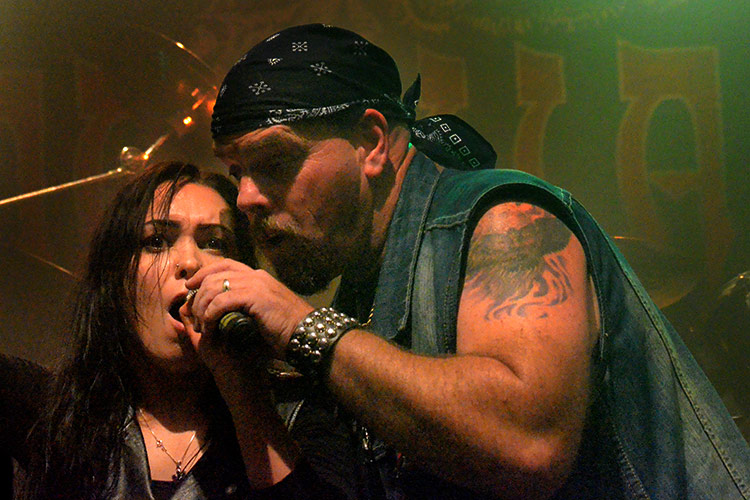 Werken, so dass es eine wahre Freude war, Songs wie „Cage of Mirrors“, „The Riddle Master“, „Dreams of Eschaton“, „Open the Gates“, „Road of Kings“ und „Divine Victim“ einmal live zu erleben. Optisch verzichtete man dabei gänzlich auf Gimmicks, die sich ob der Texte anbieten würden und präsentierte sich in zeitlosen Biker-Outfits. Bryan Patrick erwies sich als würdiger Frontmann, der das Publikum konstant anheizte, obgleich dies gar nicht vonnöten war.Die Zuschauer in den ersten paar Reihen waren eh wie hypnotisiert und bewiesen bei jedem Song absolute Textsicherheit, ältere Zuhörer folgten weiter hinten dem Geschehen auf der Bühne mit ehrfürchtiger Bewunderung. Ein netter Zug war, die Frontleute der beiden Supportbands, Alexx Stahl (oben) und Marta Gabriel (links), für jeweils einen Track als Sänger auf die Bühne zu holen, wobei allerdings das MANILLA ROAD-Feeling der Songs etwas zunichte gemacht wurde. Der Gig endete schließlich mit dem Dampfhammer „Up from the Crypt“, dem wohl schnellsten MANILLA ROAD-Stück vom „Mystification“-Album.