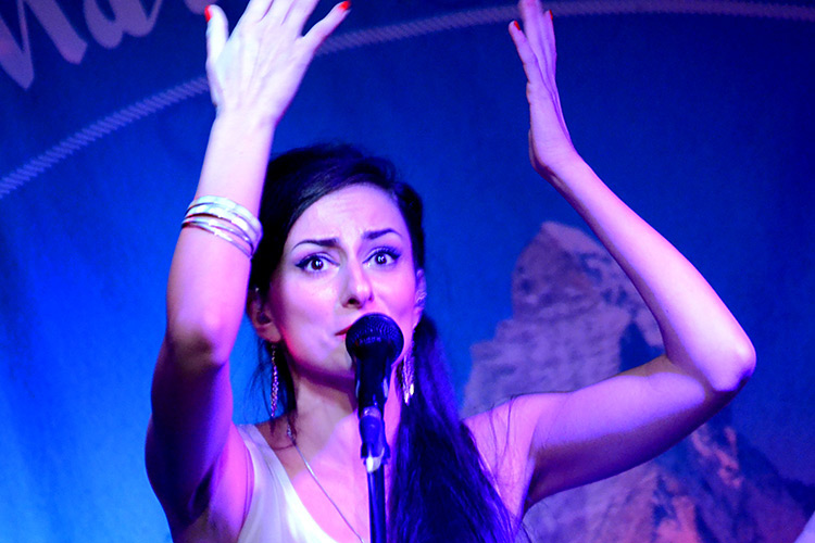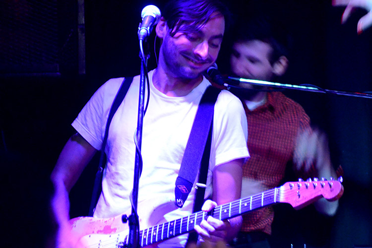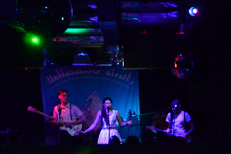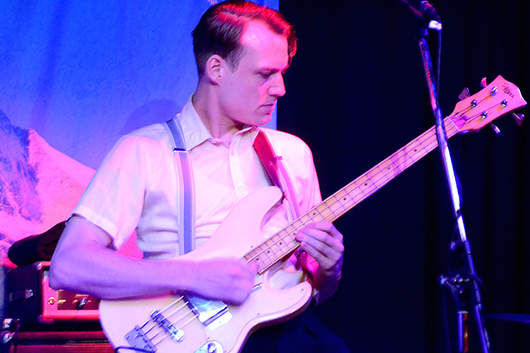 Die Herren Robert Kerner (rechts, Gitarre), Malte Tönißen (unten, Bass), Jan Siekmann (Schlagzeug) und der Keyboarder, dessen Namen ich leider nicht herausbekommen habe, sind alle noch in anderen Rock- und Jazzformationen unterwegs und lieferten eine extrem überzeugende Basis für die stimmlichen und tänzerischen Qualitäten der ballett-erfahrenen (und deswegen extrem dehnbaren) Frau (oder lieber Fräulein?) Blumenblatt. Am meisten kam das zum Vorschein bei dem nicht auf der Platte vorhandenen Instrumentalstück – Kerner gab die Rocksau, Blumenblatt überraschte mit exaltierten Moves, die sie so ähnlich bei ihrem alten Arbeitgeber, dem Pariser Crazy Horse, gezeigt haben mag.
