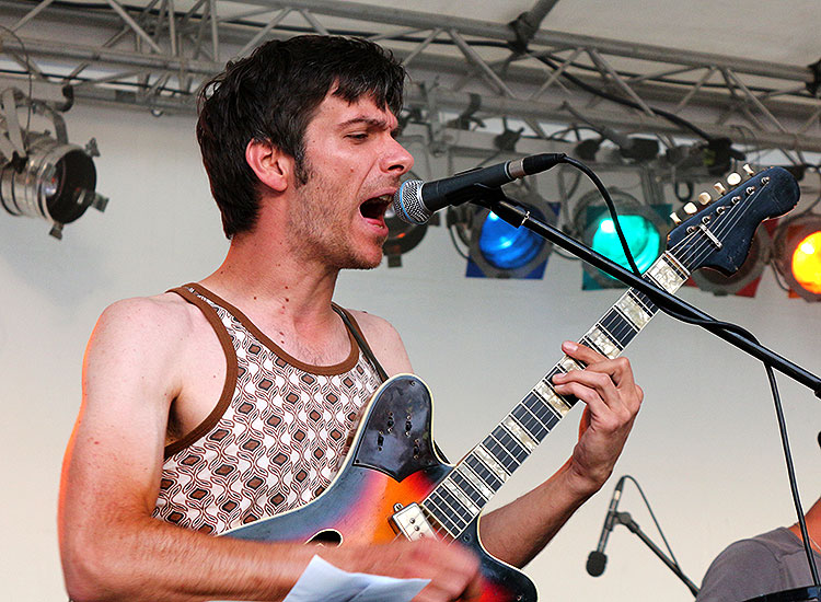 Es dauerte nicht lang, da wurde es (wie auf dem Videoclip unten zu sehen) trotz der nachmittäglichen Auftrittszeit voll auf dem Rasen. Die eingefleischten Fans der Acts auf der Feinstaub-Bühne wollten die Amerikaner sowieso mitnehmen, doch auch zahlreiche an der Mainpromenade flanierenden MUF-Gäste blieben stehen, bestaunten das quirlige Quartett und ordneten sich schließlich in die Reihen vor dem Podest ein. Das dürfte der Band nicht verborgen geblieben sein, die bestimmt eher selten um diese Tageszeit auftritt und vielleicht auch der guten