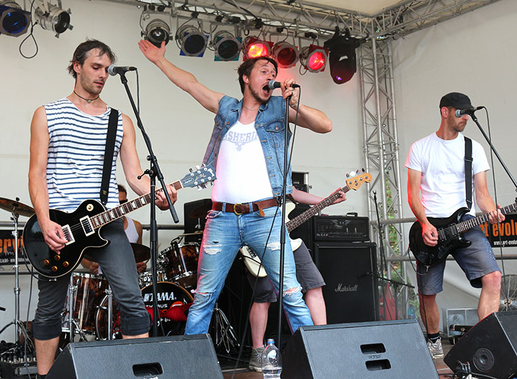 Punkrock-Legende LES SHERIFF zum Besten und tat das auch gestern unter freiem Himmel so authentisch, dass sich manch einer der unvorbereitet zur Feinstaub-Bühne gestoßenen Besucher erstmal die Augen reiben und das beim Vorbeilaufen an anderen Auftrittsstätten angefallene Ohrenschmalz entfernen musste. Denn die seit sieben Jahren existierende Truppe generiert mit den beiden Gitarren (gespielt von den Brüdern Tim und Ole) sowie der Rhythmusfraktion von Christian (Bass) und Markus (Schlagzeug) einen fetten Sound; Dreh- und Angelpunkt ist der Mittdreißiger Jacob, der (zumindest für meine Ohren) ein lupenreines Französisch spricht, singt, brüllt, herausschreit.