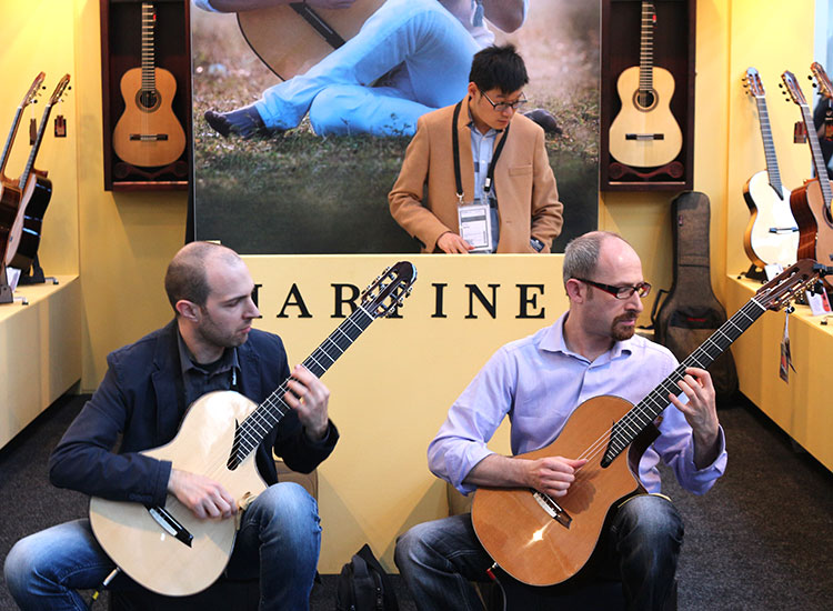 Ich lasse mich ein bisschen treiben, verirre mich erstmal in dem riesigen Hangar, in dem die klassischen Instrumente dargeboten werden. Es glänzt der Lack von Geige, Bratsche, Kontrabaß und Co. An den Ständen findet sich erstaunlich gechilltes (vielleicht auch eher erschöpftes) Personal, das an den geschäftlichen Beziehungen seines Unternehmens feilt und auf gute