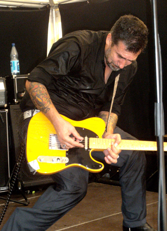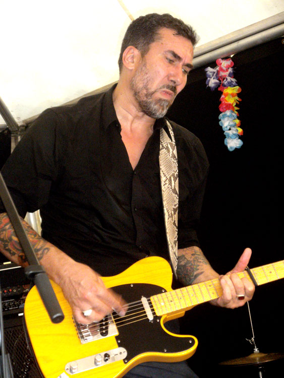 Anschließend spielte die Musik wieder auf der Bühne: Zuerst mit den sympathischen Stuttgarter SMALLTOWN ROCKETS (Foto oben), die melodischen Punkrock mit poppiger Kante darboten (tolle Songs u. a.: „She’s Gone“ und „We’re Dangerous“), später mit THE ESPOSIDOS aus Bensheim. Letztere entlockten ihren Instrumenten unter anderem die Gassenhauer des Punk-Genres. Coverversionen von Hits der RAMONES, SEX PISTOLS oder der ADVERTS ließen sowohl die Stimmungskurve als auch die Schlangen vor den Bierständen weiter anwachsen. Randnotiz: Der Gitarrist (Foto) trug nicht nur ein UK SUBS-Shirt, er ähnelte außerdem einem Charlie Harper in jüngeren Jahren. Irgendwie smart.