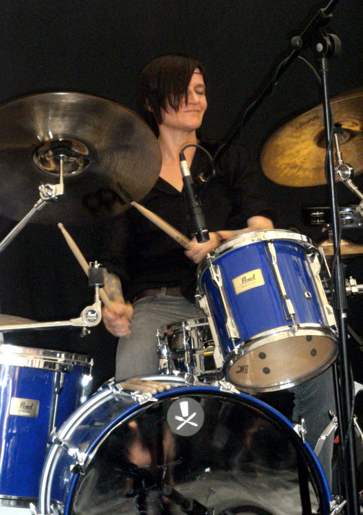 beugte sich über die umklammerte Gitarre, schien phasenweise geradezu mit seinem Instrument zu verwachsen, bis der letzte Akkord des jeweiligen Stückes verklungen war. Dazu kam sein manisch anmutender Gesang, den er nicht nur ins Mikro, sondern auch einfach in Richtung der Zuschauer schrie. Ganz nach dem Motto: „Leute, hört mir gefälligst zu. Laut genug bin ich ja. Und verdammt, ich hab euch etwas zu sagen!“ Zwischen den einzelnen Songs wichen die Anspannung und der starre Blick für einen kurzen Augenblick, aber halt: Die Mission war noch längst nicht erfüllt. One-two-three-four, und es ging wieder los.Drummerin Sue Hoffmann, von Lucky „Demolition Girl“ genannt, sorgte für den treibenden Rhythmus und gab ihrem Partner die nötige Rückendeckung. Letzteres war leider auch wörtlich zu nehmen, denn durch ihre Position in der Mitte des hinteren Teils war sie
