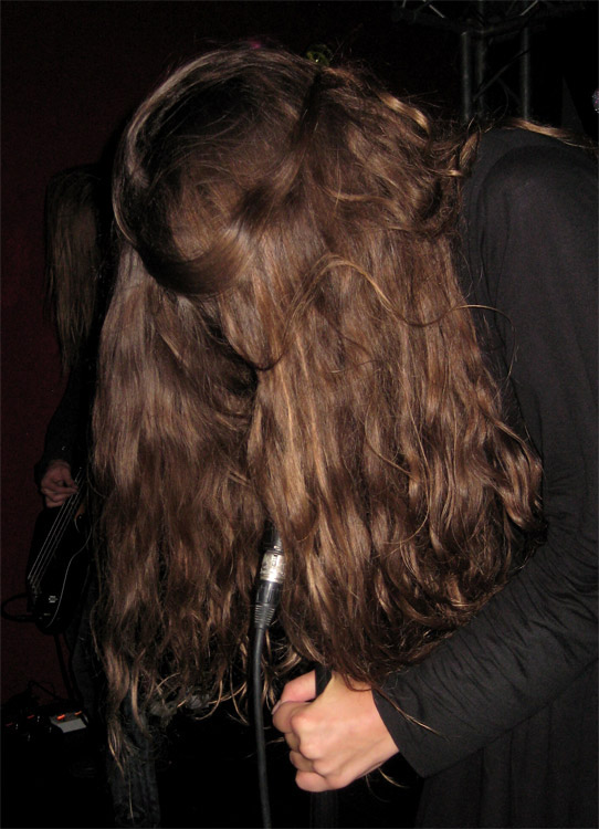 erinnerten. Ungewöhnlich war, dass das Quartett nahezu im Halbdunkel mit nur spartanischer Ausleuchtung der Bühne agierte und dass Sängerin Caro sich während des gesamten Sets auf ihren etwa einen Meter hohen Mikroständer stützte und nur selten ihr Antlitz offenbarte.