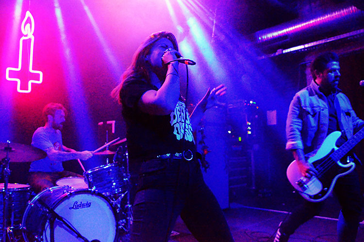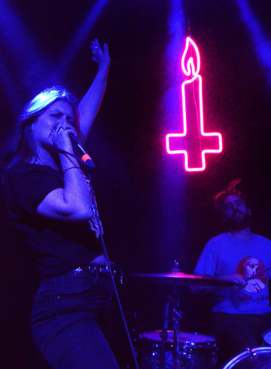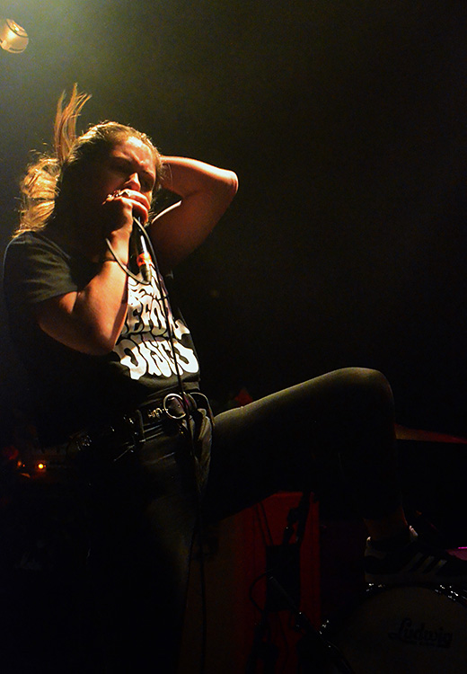 übertreiben. War ja keine Zeit dafür. Nicht nur Brumen riss Kilometer ab, rannte, rammte ihre Faust in die Luft, sprang, bängte oder sank singend zu Boden, nein: auch ihre Mitstreiter an den Saiteninstrumenten, Xavier Santillis an der Gitarre sowie Dan Bonnicis am Bass klebten kaum an ihrem Standort, im Gegensatz zum Drummer Matt Marascos, bei dem das naturgemäß schwieriger wäre.