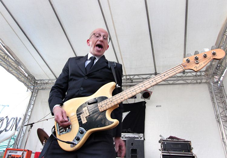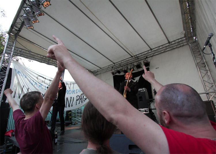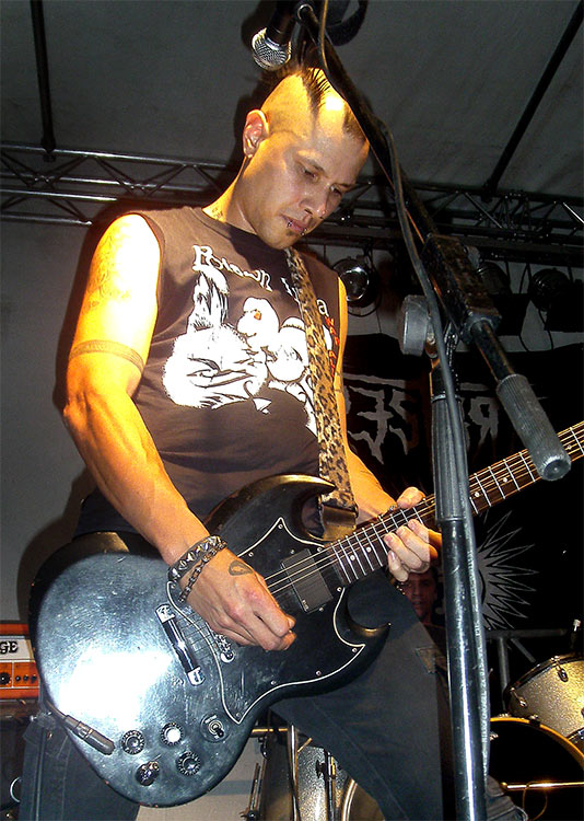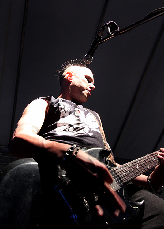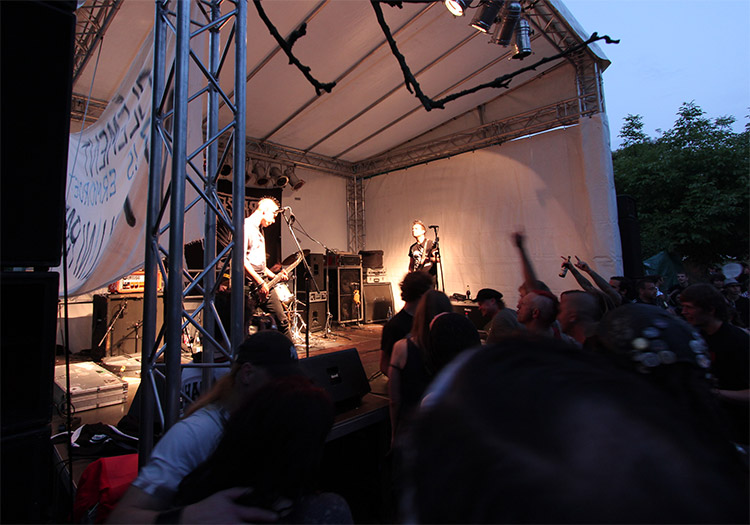 nicht ganz erschlossen. Ich dachte immer, dass das Sommerfest ein Punk-Festival sei und dass Bands wie MOVEMENT zum spießigen Establishment gehören, das es zu bekämpfen gilt. Aber das ist nur meine Meinung, andere Besucher hatten offensichtlich Spaß, zumindest war vor der Bühne ordentlich was los und die Kids waren verschwunden oder plattgetreten worden. Wie gesagt, ich habe beim Au-Fest schon Schlimmeres ertragen, wobei – und das muss ich an dieser Stelle noch einmal betonen – ich ohnehin nie wegen der Shows vor Ort bin, sondern um Party zu feiern.Aber auf Regen folgt bekanntlich Sonnenschein und auf langweilige Combos bekanntlich interessante. So war es auch in diesem Jahr, denn als nächstes