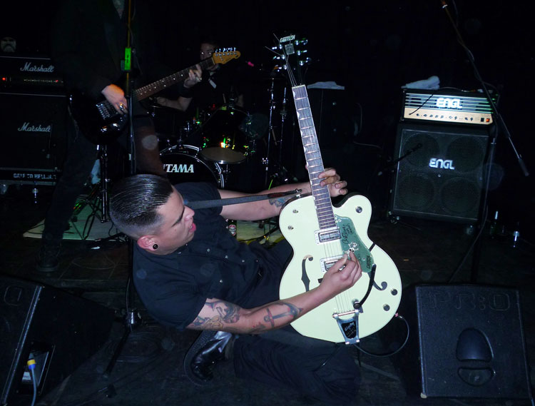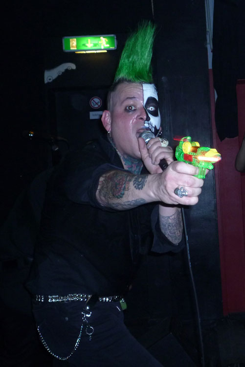 sowie seiner grellen Irokesenmähne (diesmal in grün) auf. Auch an den obligatorischen Showelementen und der Bühnendeko fehlte es nicht: Ob nun deLeon mit dem „bluttriefenden“ Kopf einer Schaufensterpuppe posierte oder wild mit einer leuchtenden Spielzeugpistole herumfuchtelte, es war immer was los. Den Marshall-Verstärker zierten zwei Totenköpfe (Foto davon in der Galerie).