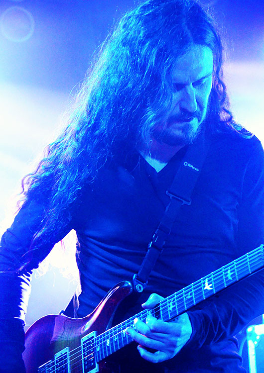 Ende, hoffentlich, alle beseelt und glücklicher als zuvor nach Hause gehen könnten. Na dann. „Coda“ ertönte als erstes (von 2013), und der Gitarrist Maciej Meller wurde auf die Bühne gebeten. Nicht als der „Neue“ von RIVERSIDE (das mag vielleicht irgendwann anders passieren), sondern als Gast. Allerdings ist Meller einer, der schon lange zum erweiterten Kreis der „Familie“ zählt. Vor kurzem erschien ein Trioalbum von ihm, Duda und Maciek Golyźniak am Schlagzeug („Breaking Habits“).