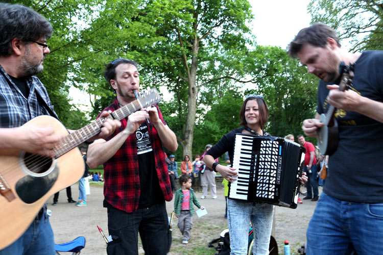 irgendwie hat das Ganze sowieso etwas von einem Veitstanz um ein Lagerfeuer (das es aber natürlich heute im Park nicht gibt). Zwischendurch wird auch mal ein Song a cappella zum Besten gegeben und die Kehle mit einem Schluck aus dem Flachmann befeuchtet. Echt irisch, eben… Und ich bin froh, ein bisschen flüssigen Proviant im Rucksack zu haben, denn wer schonmal die Rödelheimer Musiknacht besucht hat, der weiß, dass Kioskschlangen seeehr lang sein können.
