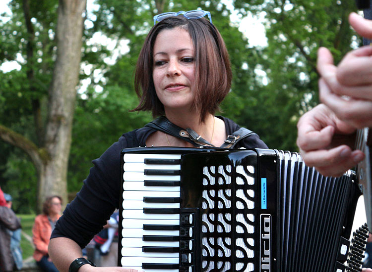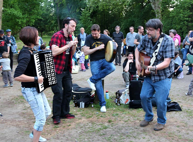 Blistering Barnacles gibt es, in wechselnder Besetzung, schon seit 23 (!) Jahren, und diesen Erfahrungsschatz merkt man ihnen in jeder Sekunde an. Erwachsene Zuhörer zucken mit den Gliedmaßen, Kinder hüpfen wild herum. Kein Wunder, gilt doch der Folk von der grünen Insel als die Gute-Laune-Musik schlechthin. Die Atmosphäre im Park bei bestem Wetter tut ein Übriges für prima Stimmung in der langsam hereinbrechenden Abenddämmerung.