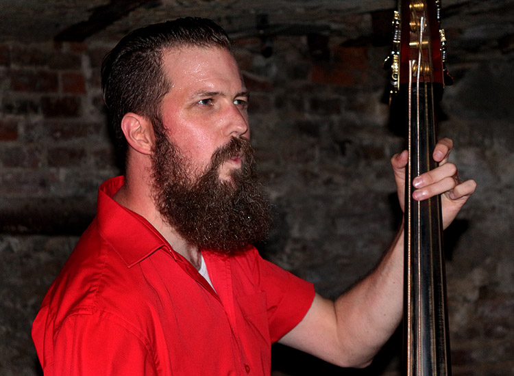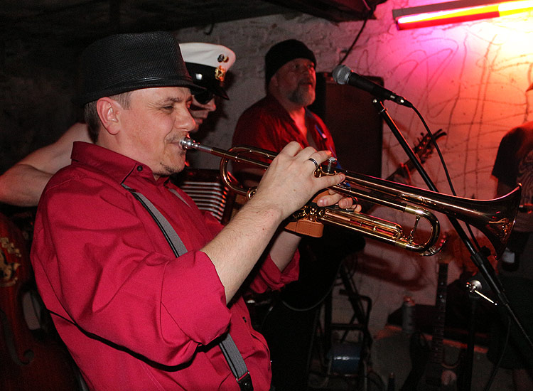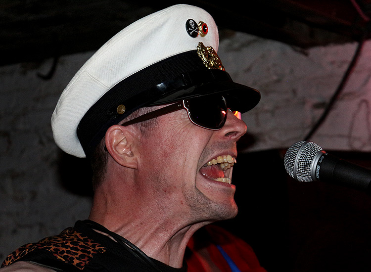 Ich habe Johnny Torpedo im Lauf der vergangenen Jahre schon in allen möglichen Besetzungen gesehen, mal allein, mal im Duo, mal mit dem stimmgewaltigen Fiskecore, mal ohne, mal als Trio mit Gitarre und Kontrabaß. Das heutige Line-Up ist allerdings neu: Neben den bewährten Kräften Mr. “Skip” Jack Tuna an den sechs und Stiggy Hoo-La an den vier Saiten ist diesmal auch der Trompeter Garry Zaro an Bord. Und der passt für meine Begriffe ausgezeichnet sowohl zur Musik als auch zur Show.