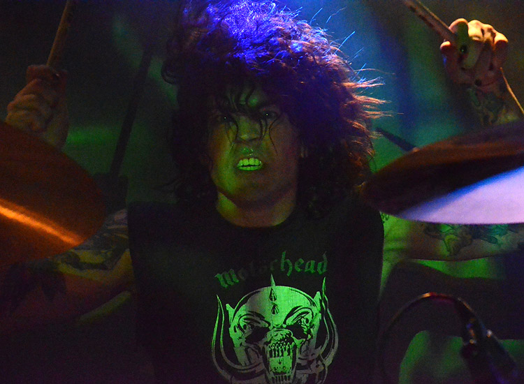 Bevor ich diese Combo prüfenden Ohres jedoch zu hören bekam, schlenkerten LAZLO LEE & THE MOTHERLESS CHILDREN (rechts) auf die Bühne, ein Duo laut allwissendem Internet, das allerdings zu dritt auftrat. Namensgeber Lazlo fragte, ob wir Rock’n’Roll mögen? Klar doch. Metal? Sicher. Punkrock? Aber hallo! Nach Kiffermucke hat er nicht gefragt, so weit ich noch weiß. Und dann ging es los, meine Fresse! Das war Musik für den Dreikönigskeller, in dem meine Rockstage Riot-Kollegen zeitgleich weilten und denen das superb geschmeckt haben dürfte, hätten sie denn kosten können.
