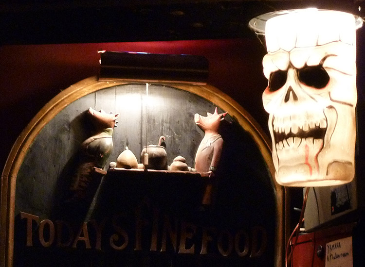 Huaah, jetzt wird’s gruselig! Totenkopflampen erhellen den Tresen-Bereich dieser Konzert-Institution. Wo hängen die schaurig-schönen Leuchten?