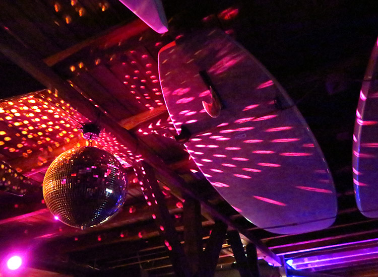 Ein Surfboard an der Decke neben einer Discokugel, und das fast direkt über der „Bühne“. Wo gibt’s denn sowas?