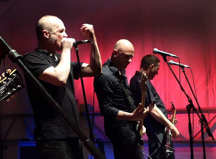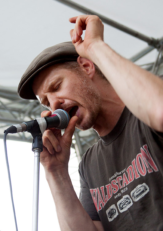 erste bekannte Gesicht: Sänger Üni Erler (rechts), seines Zeichens langjährige Stimme der verblichenen FRAU DOKTOR, die schon zig Mal in der Rödelheimer Institution gespielt haben. CYCC setzen ungefähr da an, wo FRAU DOKTOR aufgehört haben. Tanzbare Rhythmen, hervorgebracht von einer kraftvollen Bläsersektion, Gitarren, Keyboard und Drums. Nun geht’s allerdings weg vom Ska, und mehr in Richtung Soul. War fein anzuhören. Es muss nicht immer Punk sein, und bei einem Festival ist auch die Abwechslung Trumpf. Finde ich jedenfalls. Und es freute mich für die sympathischen Wiesbadener, dass nach dem vorausgegangen